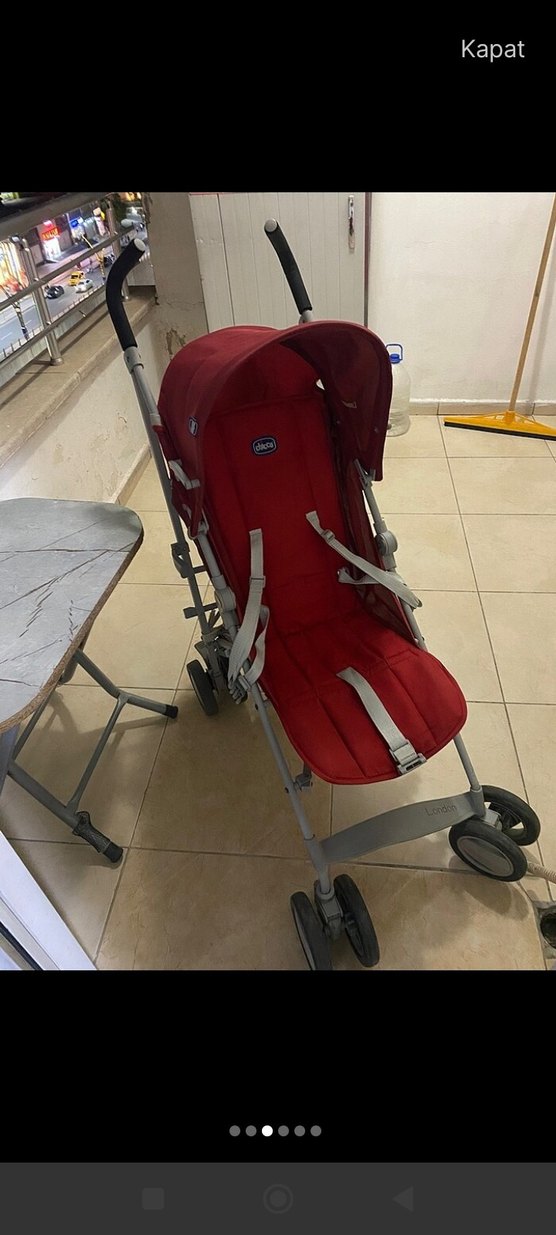 Kırmızı oturma alanı ve gri çerçeve detaylarına sahip bebek arabası. Güvenlik kemerleri ve dört tekerlekli hafif tasarım sunar. kullanıma baglı çizikler vardır onun dısında sorunsuzdur