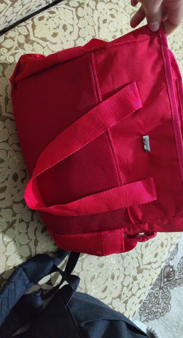 Canlı kırmızı renkte, sade desenli ve sağlam saplı bebek bakım çantası.