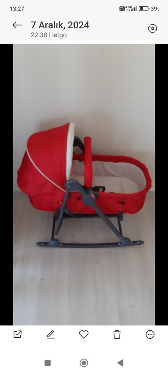 Kırmızı dış yüzeyli ve gri çerçeveli, yumuşak iç dolgulu bebek beşiği. Tente ve rahat kullanım sağlar. 6 farklı kullanım özelliği var ..