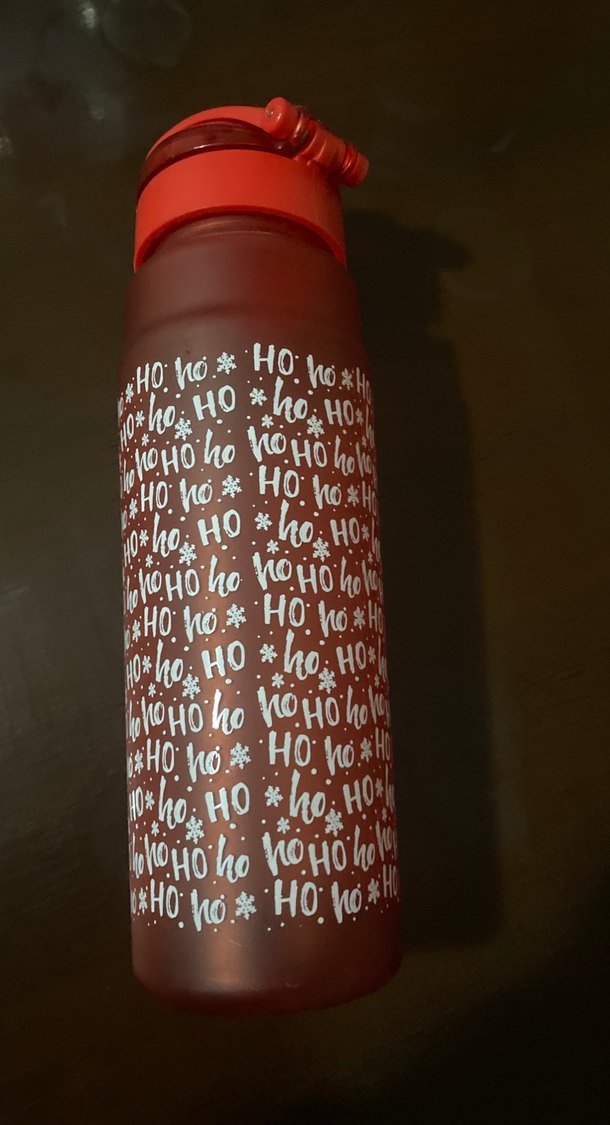 Koyu kırmızı renkte, üzerinde beyaz "Ho Ho" yazıları ve kar tanesi desenleri bulunan, kolay içim için musluklu kapaklı bebek biberonu.