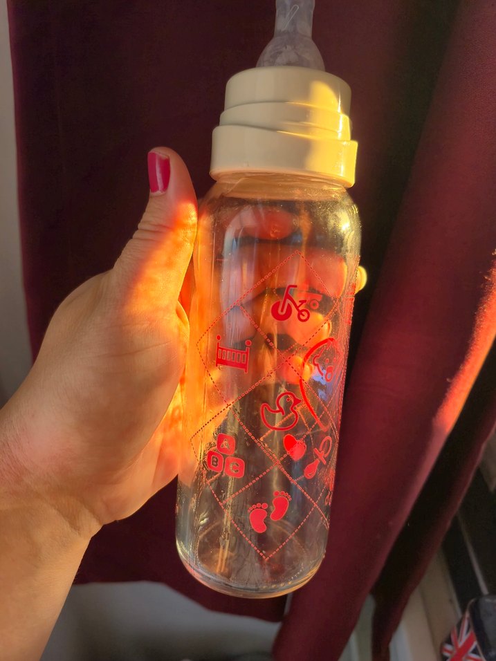 Kırmızı bebek temalı baskılara sahip şeffaf bebek biberonu, açık renk emzik ile birlikte.
