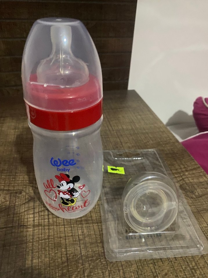 Kırmızı kapaklı, renkli Mickey Mouse desenli bebek biberonu. Koruyucu şeffaf kapak ve ekstra emzik ile birlikte.