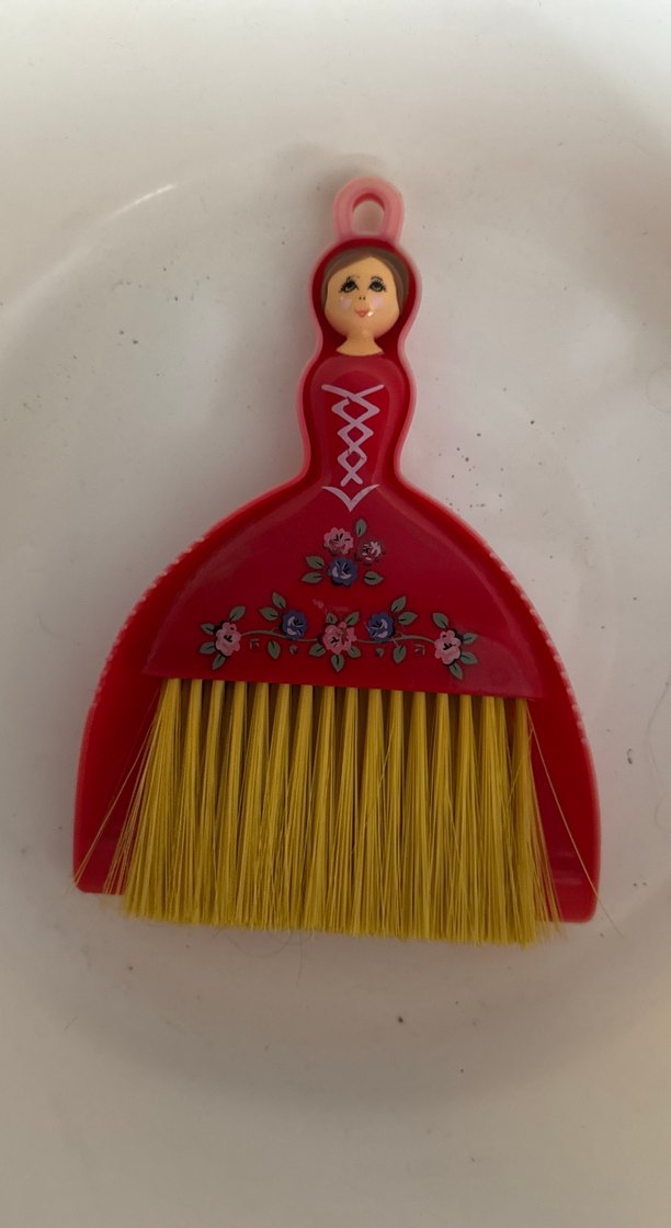 Kırmızı elbiseli, çiçek desenli bebek şeklinde renkli temizlik fırçası. Sarı kılları ve sapında & işareti bulunur.