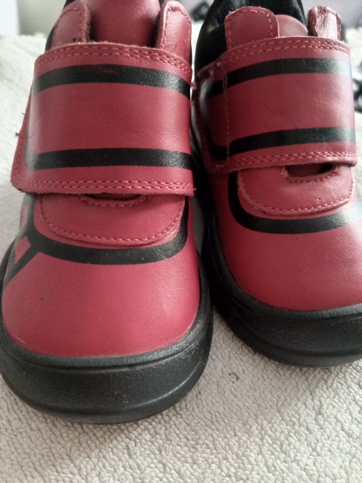 Kauçuk tabanlı, kırmızı ve siyah çizgili, cırt cırtlı, sokak stili erkek bebek ilk adım ayakkabısı.