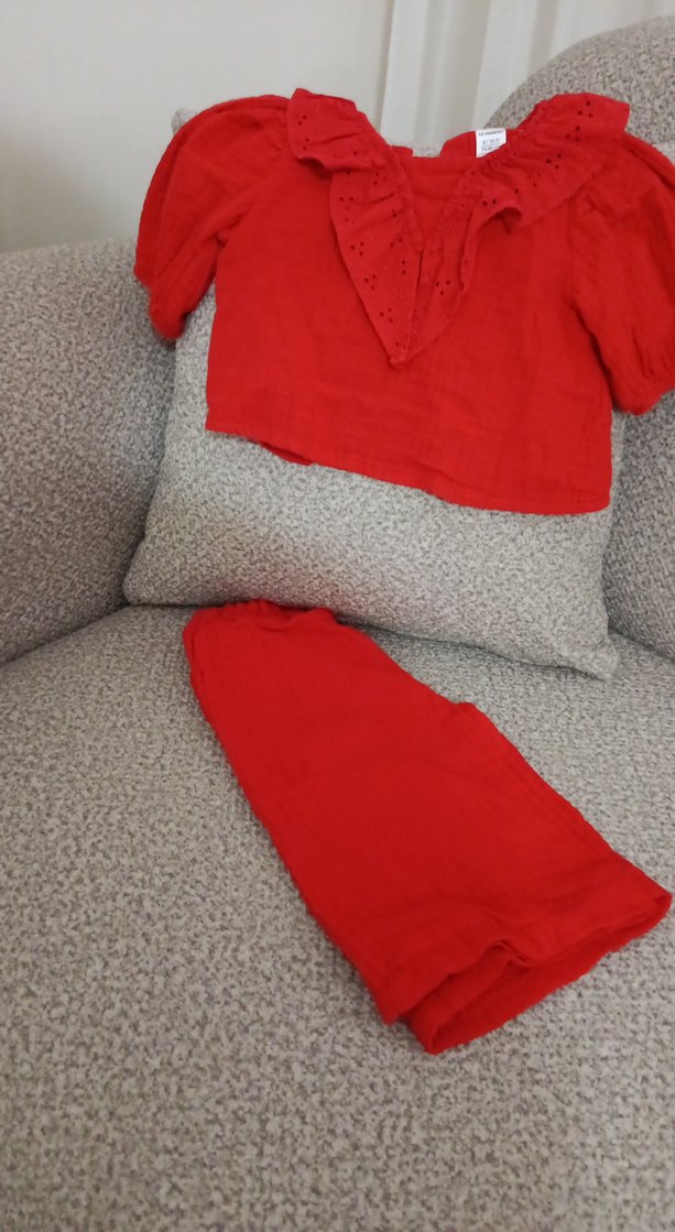 Kırmızı uzun kollu üst ve uyumlu pantolondan oluşan bebek kız takımı, zahmetsiz şıklık sunar.