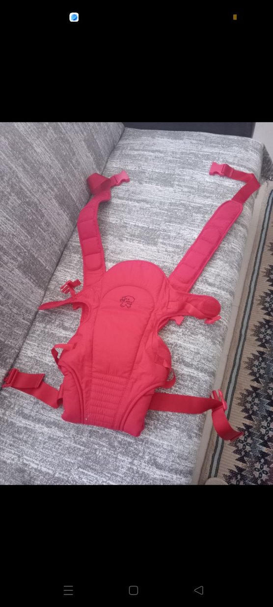 Kırmızı renkli, ayarlanabilir kayışlara ve konforlu dolgulara sahip bebek taşıyıcı. Eller serbest taşıma için güvenli destek sunar.