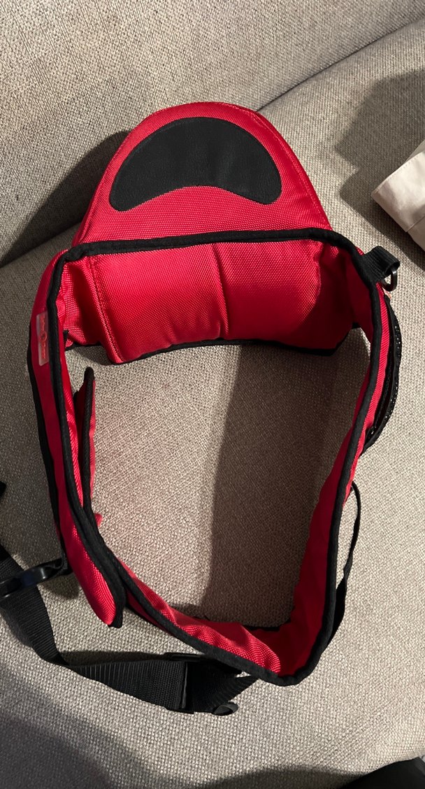 Gri detaylı kırmızı bebek taşıyıcı, rahat ve güvenli taşımaya uygundur. Ayarlanabilir kayışları sayesinde iyi oturur.