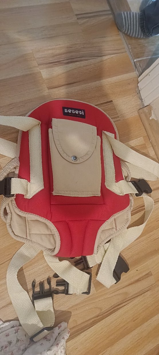 Açık kırmızı renkli, ayarlanabilir bej kayışlara ve küçük eşyalar için ön cebe sahip bebek taşıyıcı.