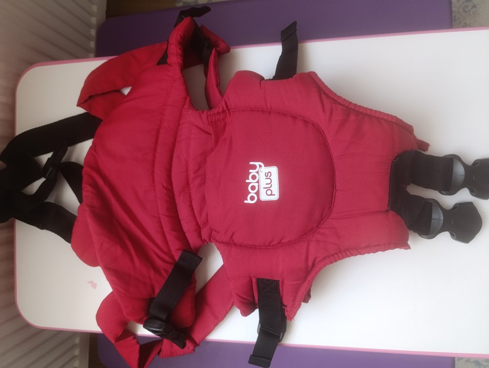 Ayarlanabilir kayışlara ve yumuşak desteklere sahip kırmızı Baby Plus bebek taşıyıcı. Güvenli ve eller serbest taşıma sağlar. Herhangi bi yırtığı defosu bulunmamaktadır.Temiz üründür.