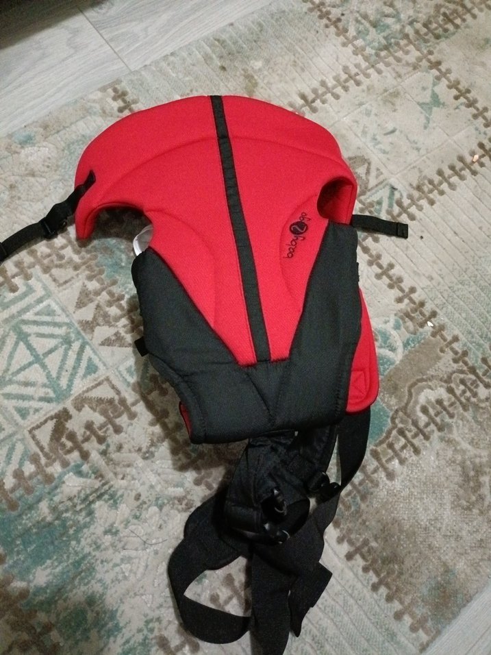 Koyu kırmızı ve siyah renkte, ayarlanabilir askılara sahip bebek taşıyıcı. Bebeğiniz için güvenli destek sağlar.