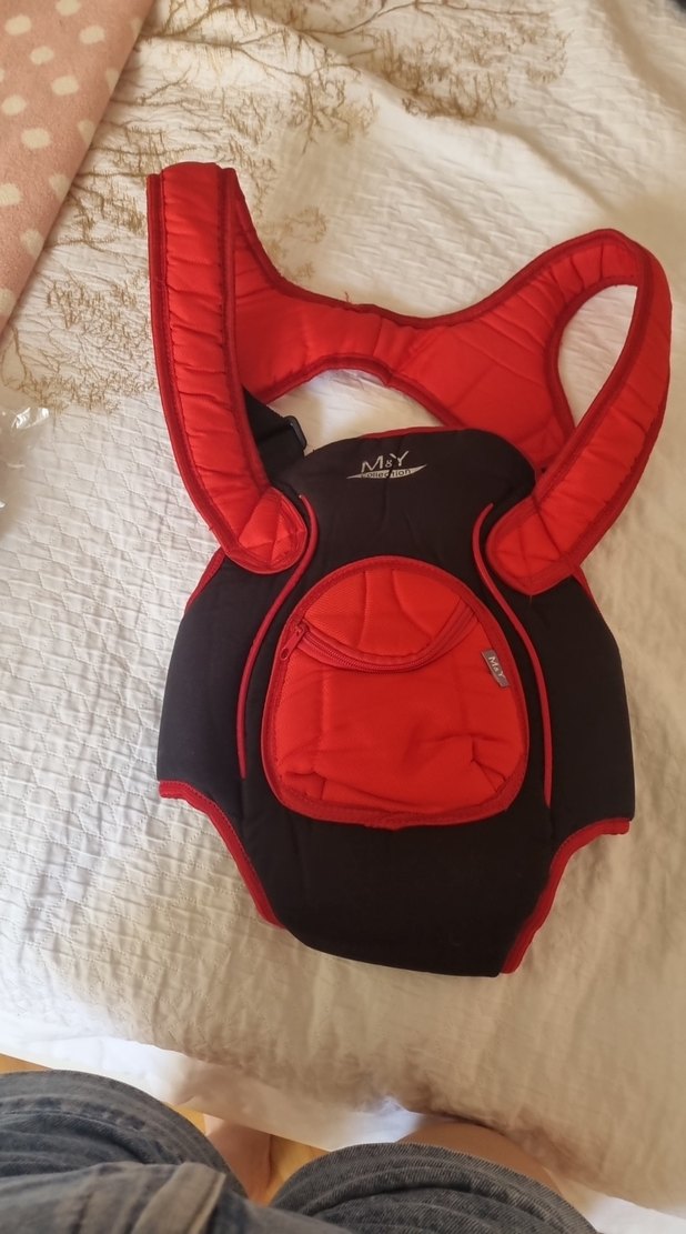 Koyu kırmızı renkli, yumuşak dolgulu omuz askıları ve ön cepli bebek taşıyıcı kanguru. Rahat taşıma sağlar.