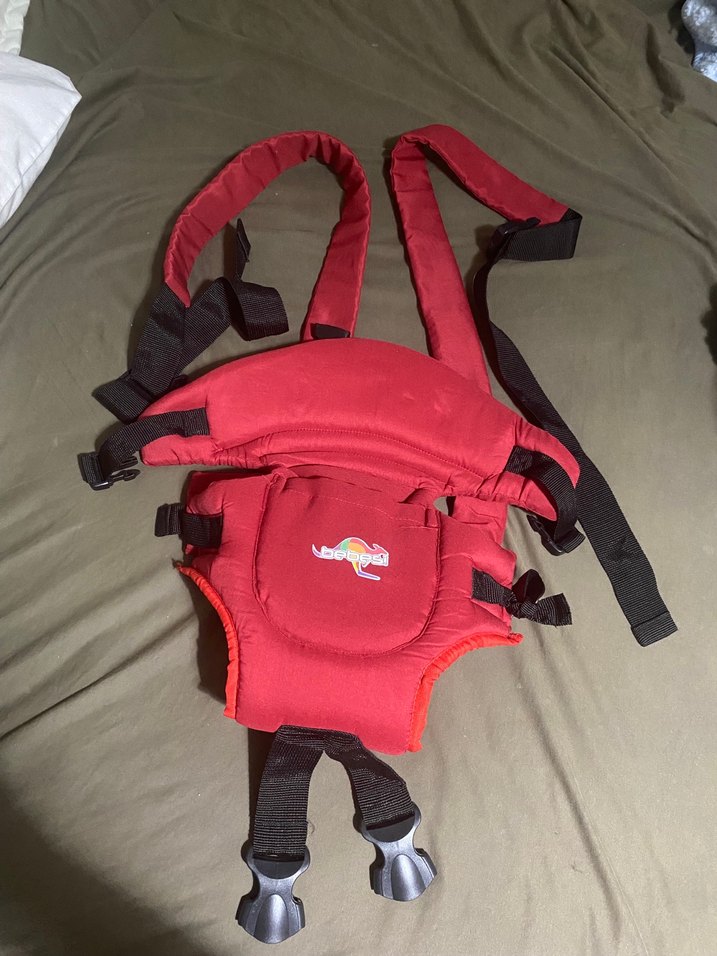 Renkli kırmızı bebek taşıyıcı, ayarlanabilir askılar ve güvenli tokalarla rahat ve güvenli taşıma sağlar. Ergonomik destek sunar.