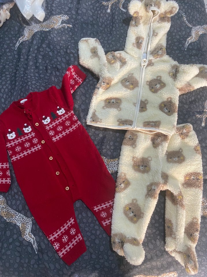 Kırmızı renkli triko tulum ve ayıcık desenli, yumuşak polar kumaştan oluşan iki parçalı bebek tulum seti. Rahat ve renkli sokak giyimi için uygun. Satıldı