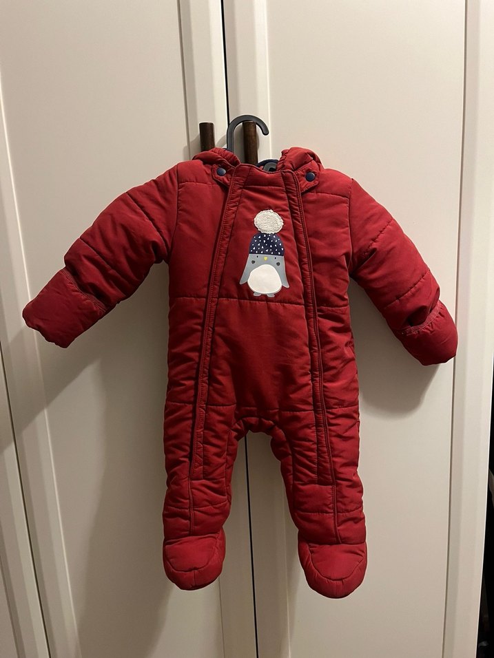 Koyu kırmızı renkte, yumuşak ve sıcak kumaştan yapılmış, fermuarlı bebek tulumu. Kapüşonlu ve cüce desenli, sokak tarzına uygun. Beden 6-9 ay