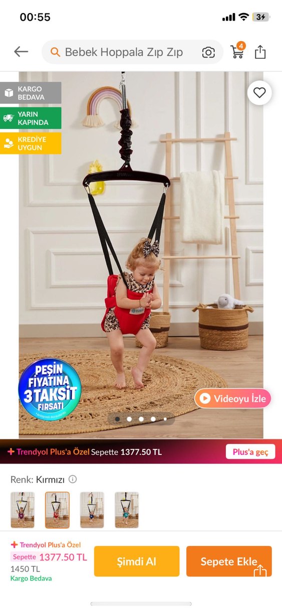 Kırmızı renkli, askılı bebek yürüteci. Bebeğin hareketini destekleyen güvenli tasarım ve renkli görünüm sunar. Ev içinde kullanıma uygundur.