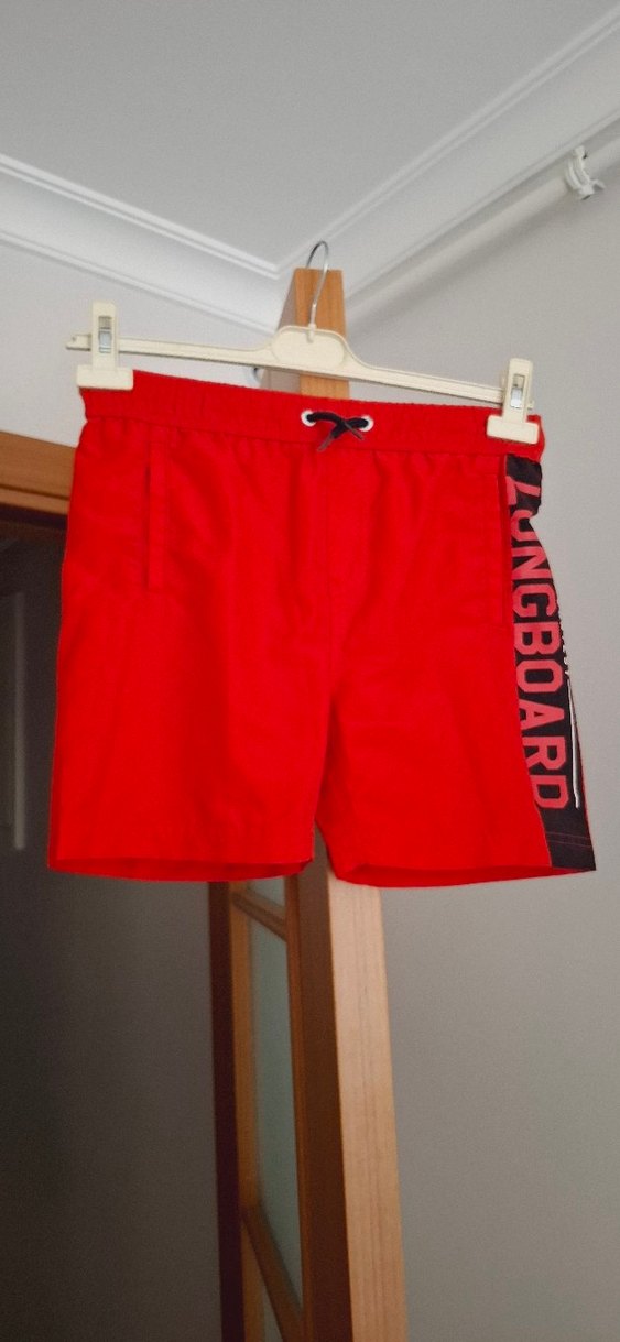 Renkli kırmızı, bel bantlı ve siyah yan panelde "LONGBOARD" yazılı, bol kesim erkek mini şort. Plaj ve sokak stili için uygun.