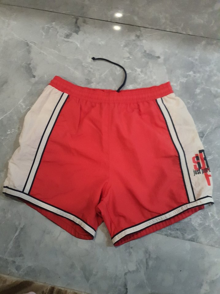 Kırmızı ve krem yan panelli, bel lastikli ve ipli erkek mini spor deniz şort. Sentetik kumaştan, renkli ve sportif bir tarz sunar. hiçbir deformasyonu yoktur