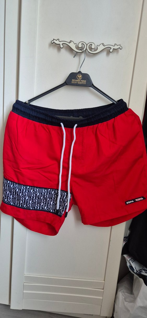 Bol kesim erkek şort, kırmızı renk ve siyah-beyaz desenli kemer detayıyla plaj için uygundur. Elastik bel ve beyaz bağcık bulunur.