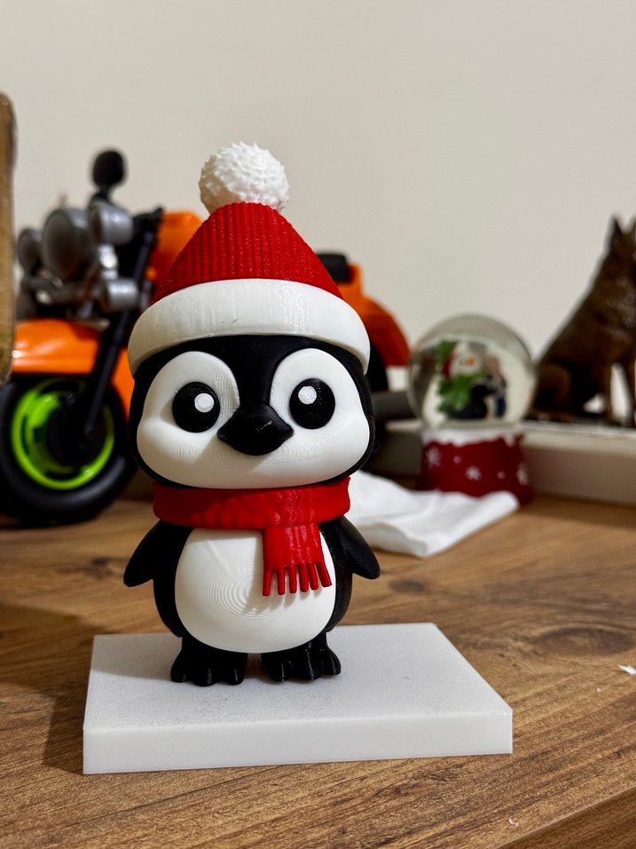 Kırmızı bere ve atkı takan renkli penguen figürü, beyaz bir kaide üzerinde duruyor.