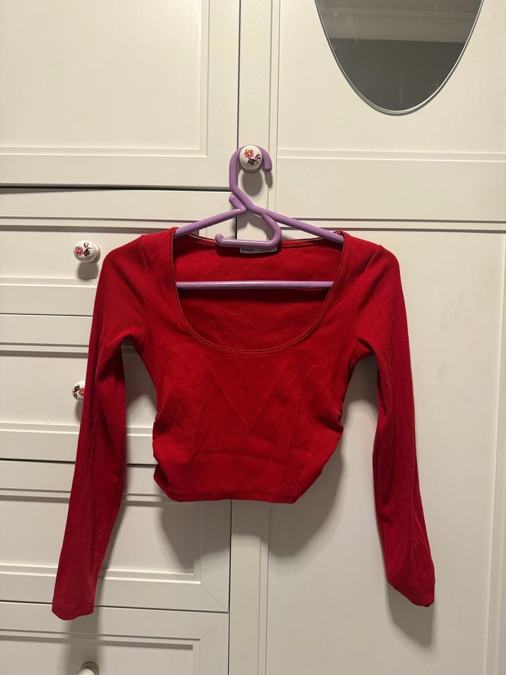 Dar kesim, uzun kollu, yuvarlak yakalı kırmızı süet crop top. Günlük kullanım için cesur ve şehirli tarz sunar. Small beden. Defosu yok bir kere giyildi.