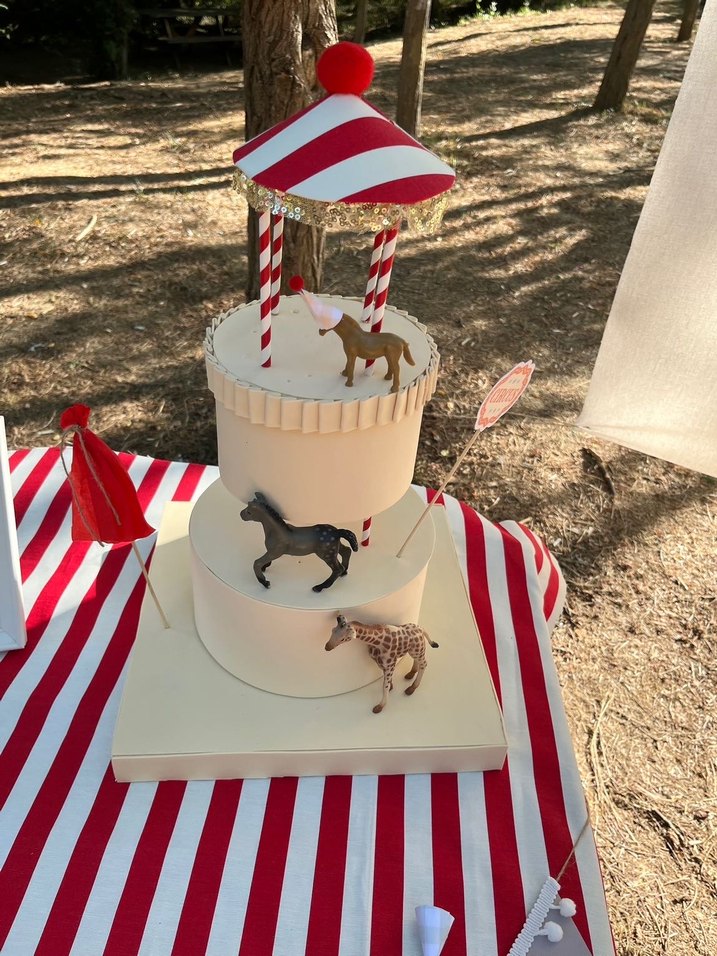 Kırmızı beyaz çizgili şapkalı beyaz atlı karınca temalı parti dekoru. Sadece pastanın üzerindeki çadır fiyatıdır