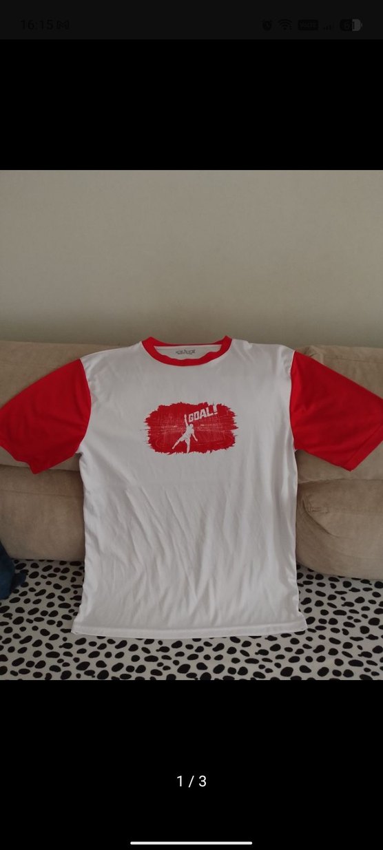 Pamuk kumaştan, kısa kollu, yuvarlak yaka ve bol kesim erkek tişörtü. Kırmızı kollar ve beyaz gövde üzerine renkli baskı bulunur. Spor ve günlük kullanım için uygun. ⚽