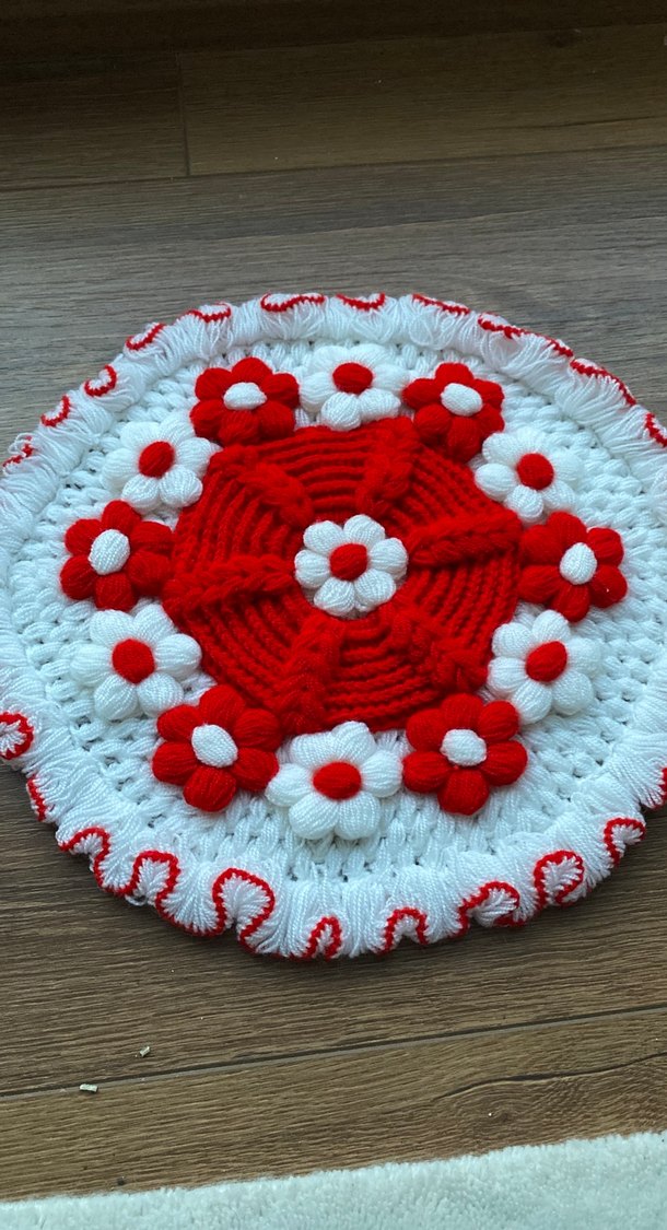 Kırmızı ve beyaz el örgüsü çiçeklerle süslenmiş yuvarlak banyo lifi hiç kullanılmadı