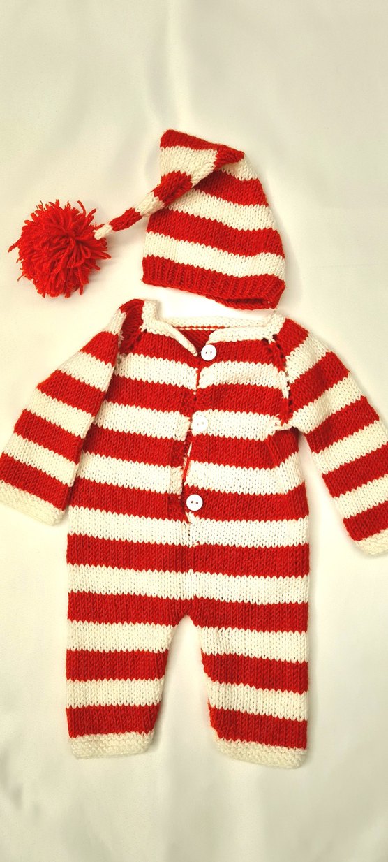 Kırmızı ve beyaz çizgili, uzun kollu, yuvarlak yakalı yumuşak triko bebek tulumu ve şapkası.