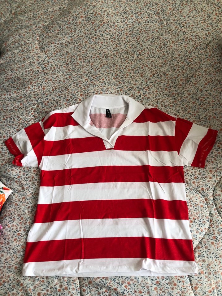 Kısa kollu, yakalı ve düğmeli hamile tişörtü. Kırmızı ve beyaz renkli çizgili, pamuklu ve rahat kesimden oluşur.