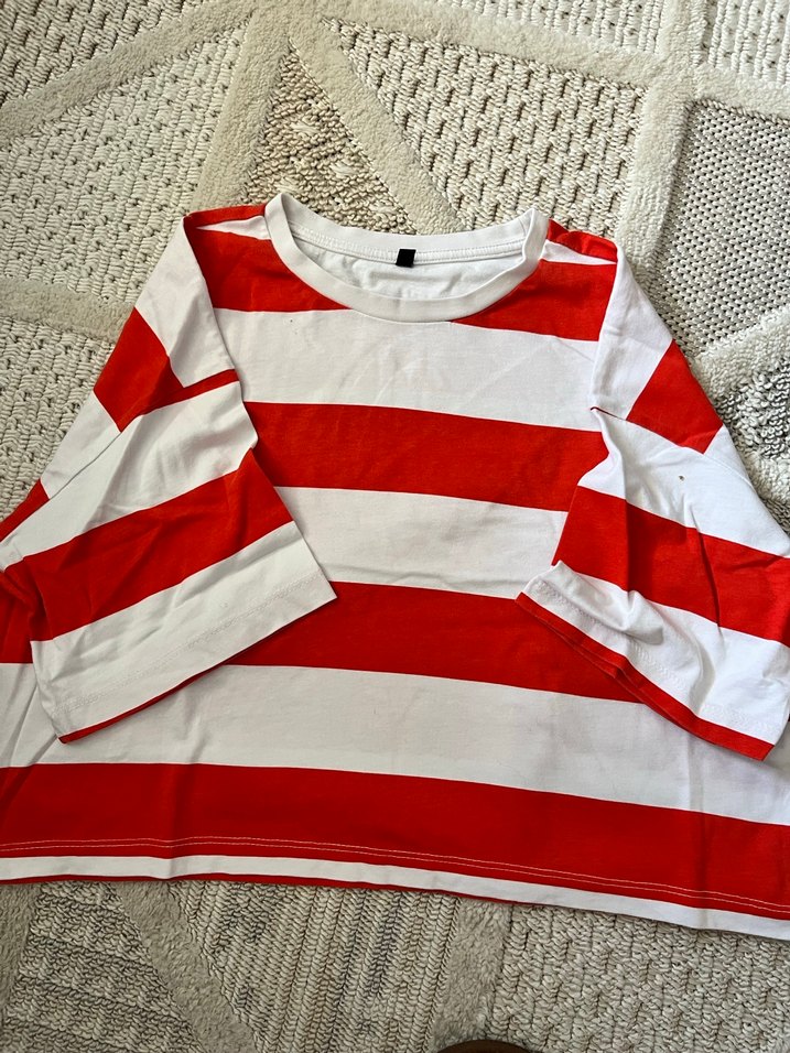 Uzun kollu, yuvarlak yakalı, bol kesim hamile tişörtü. Pamuklu, örme kumaştan, kırmızı beyaz çizgili, günlük kullanıma uygun.