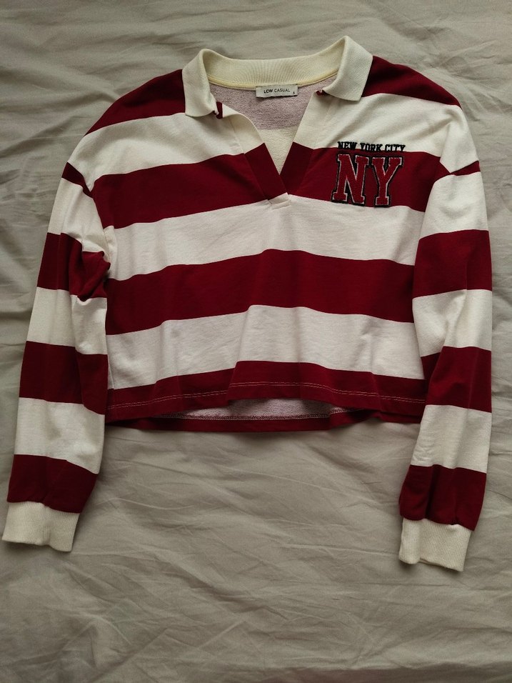 Uzun kollu, yakalı ve bol kesim kadın sweatshirt. Örme pamuktan, koyu kırmızı ve beyaz çizgili, NY işaretli. Günlük kullanıma uygun rahat bir model.