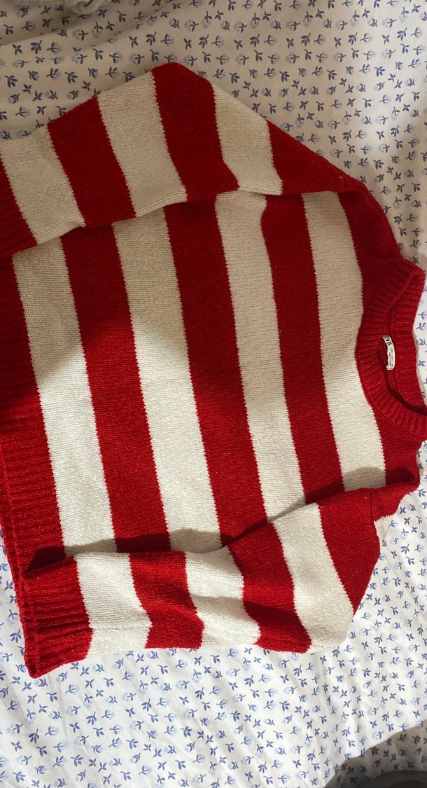 Kadınlar için kırmızı beyaz çizgili, uzun kollu, yuvarlak yakalı triko kazak. Yumuşak örgüden yapılmıştır, rahat ve renkli bir normcore tarz sunar. Çok az tülerme mevcut.