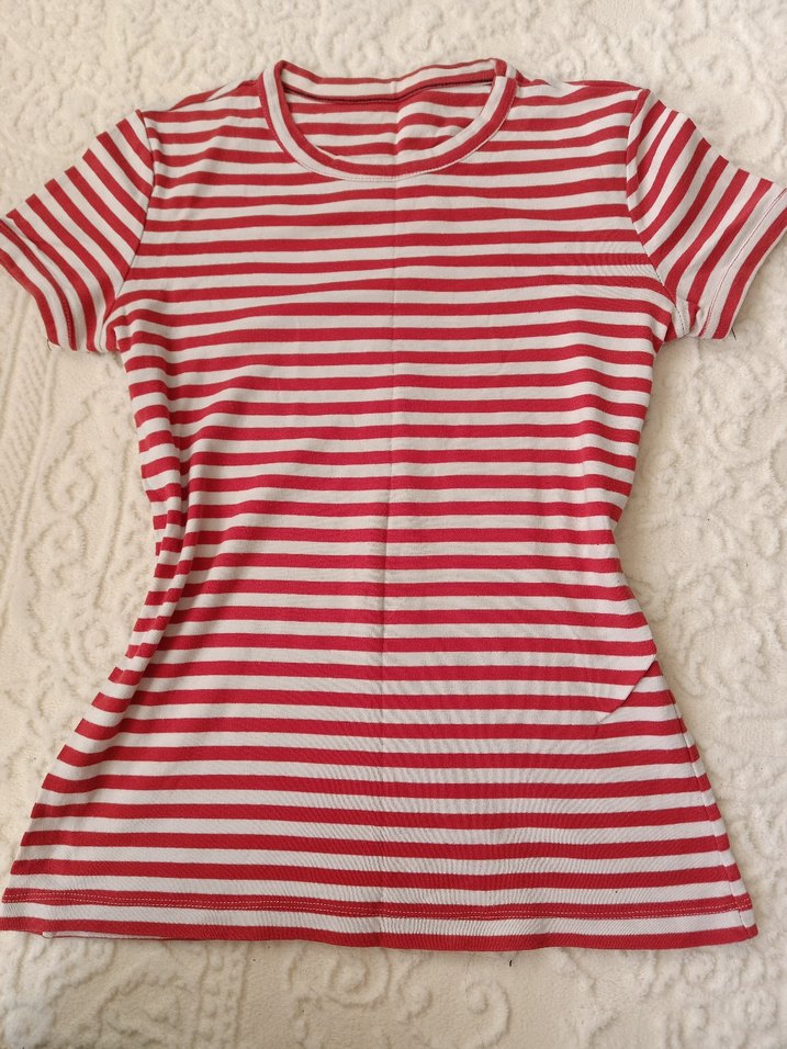Kırmızı Beyaz Çizgili Kısa Kollu Kadın Tişört