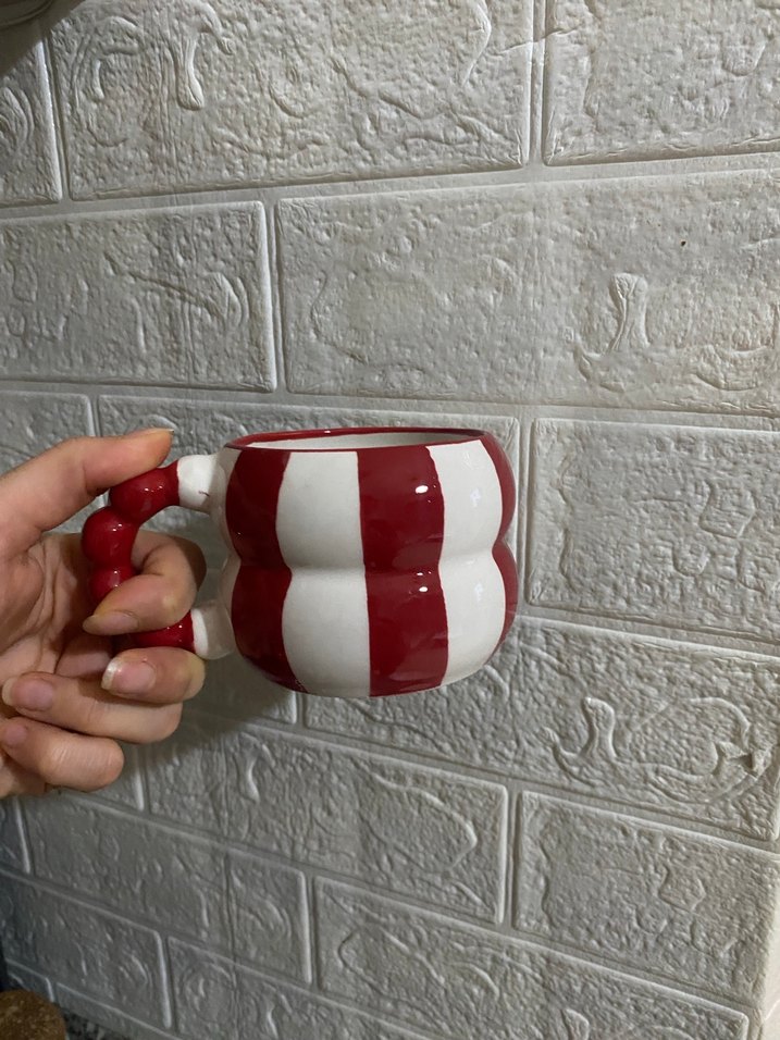 Kırmızı ve beyaz çizgili seramik kupa, yuvarlak formda ve boncuklu kulplu, renkli bir tasarıma sahiptir. ☕