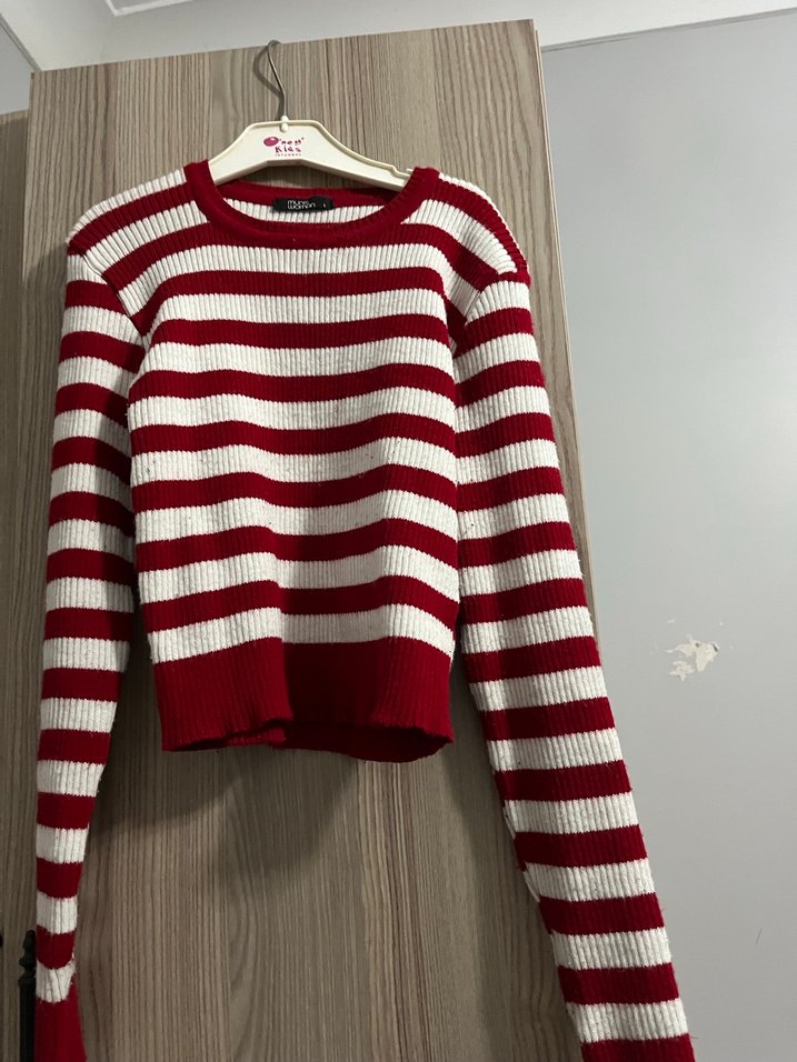 Uzun kollu, yuvarlak yakalı, kırmızı beyaz çizgili triko kazak, rahat ve şık bir günlük kullanım için uygundur.