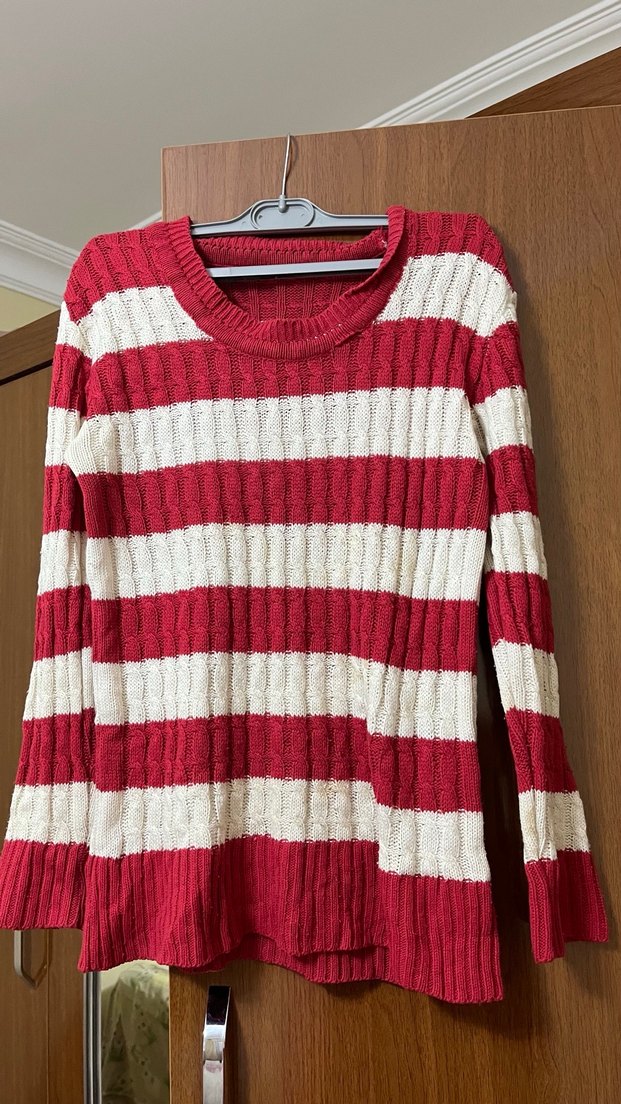 Bu kadın kazağı, bol kesim, uzun kollu ve yuvarlak yakalıdır. Kırmızı ve beyaz çizgili, renkli ve örgü kumaştan olup, günlük rahat kullanım için uygundur.