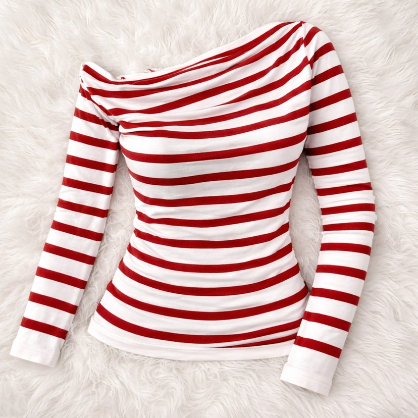 Tekne yaka, uzun kollu, drapeli, kırmızı beyaz çizgili bluz. Normal boyda, yumuşacık kumaştan üretilmiştir, şık ve rahat günlük kullanıma uygun.