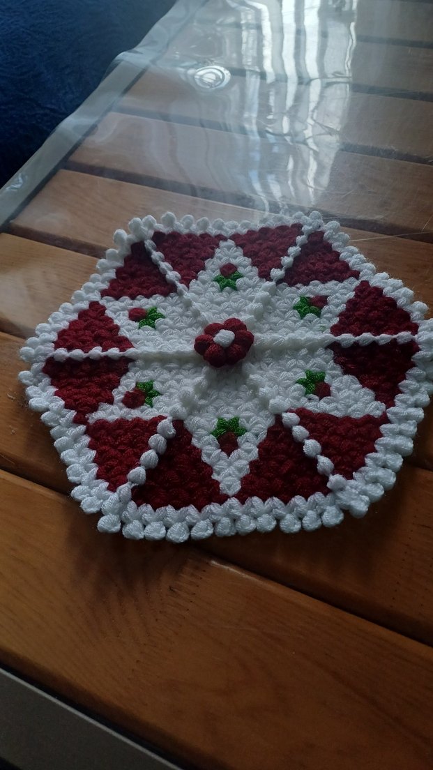 Kırmızı, beyaz ve yeşil renklerde el yapımı altıgen motifli tığ işi lif, mutfakta kullanıma uygun.