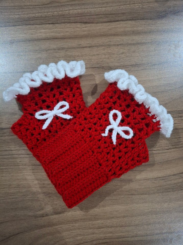 Kırmızı örgü kadın eldivenler, beyaz fırfırlı kenarları ve süs fiyonklarıyla sıcak ve klasik bir tarz sunar.