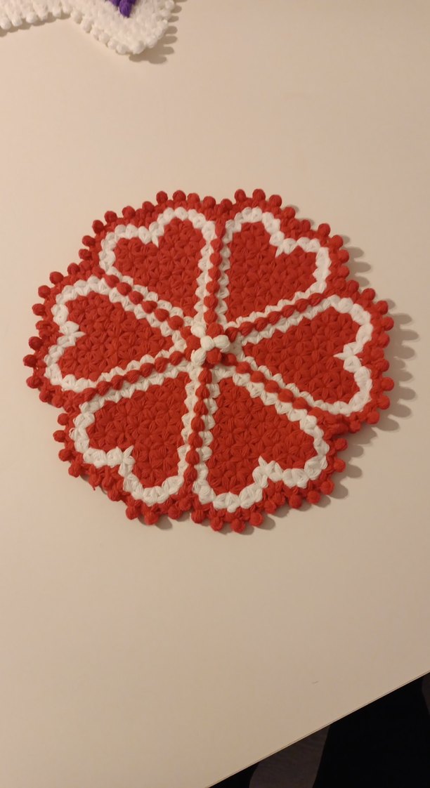 Kırmızı kalp desenleri ve beyaz bordürlü yuvarlak el örgüsü banyo lifi, masanıza geleneksel bir dokunuş katar.