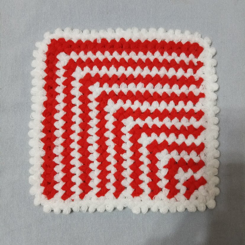 Kırmızı ve beyaz örgü desenli, yumuşak dokulu renkli banyo süngeri.