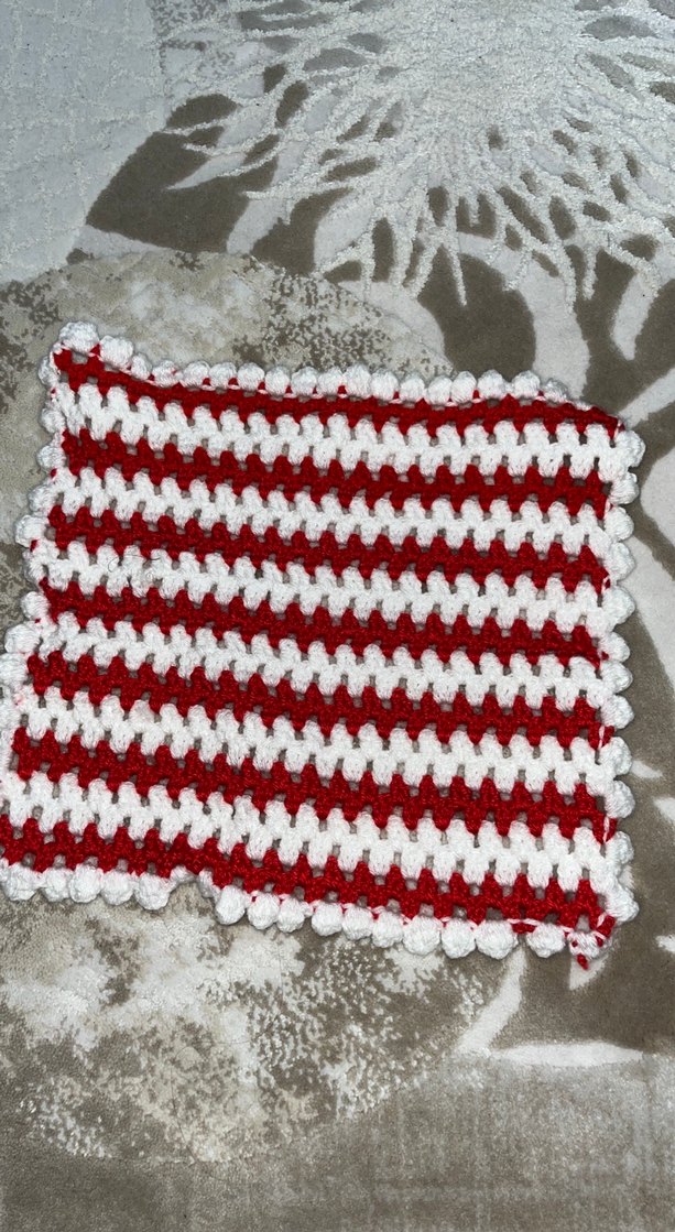 Kırmızı ve beyaz çizgili örgü tasarıma sahip, renkli banyo süngeri. Yumuşak ve nazik temizlik için uygundur. El yapımı