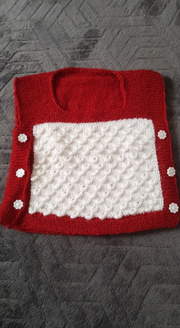 Kırmızı kenarlı, dokulu beyaz ön panelli ve beyaz çiçek düğmeli örgü bebek önlüğü.