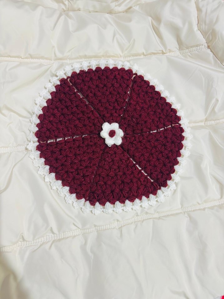 Altı beyaz çiçek desenli, kırmızı beyaz yuvarlak örgü Lif Geleneksel el işi tasarımı ve dalgalı kenarıyla. Takli fıyattır