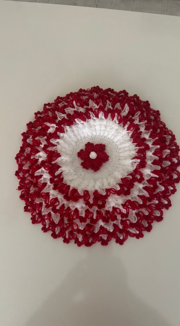 Ortası çiçekli kırmızı ve beyaz el yapımı örgü, ince dokulu ve dekoratif desenlere sahip.
