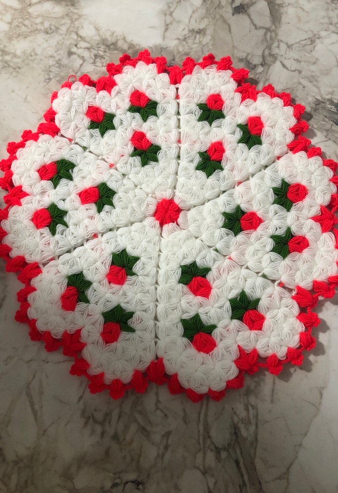 Kırmızı, beyaz ve yeşil renklerde geleneksel desenli örgü dekoratif lif