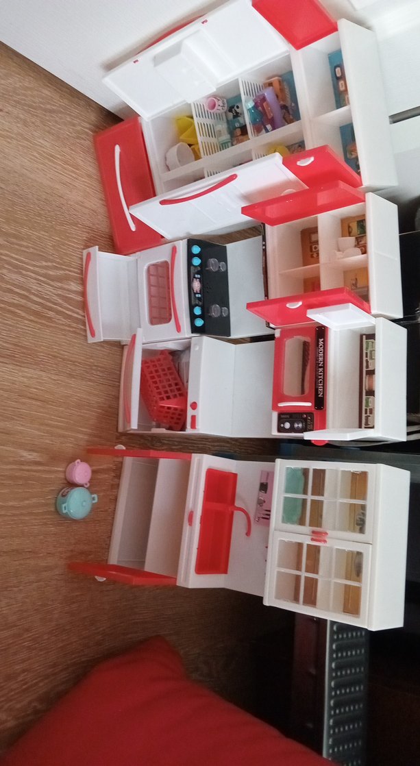 Kırmızı ve beyaz renklerde oyuncak mutfak seti, fırın, ocak, mikrodalga ve dolaplar içerir. ocak ses cikarir