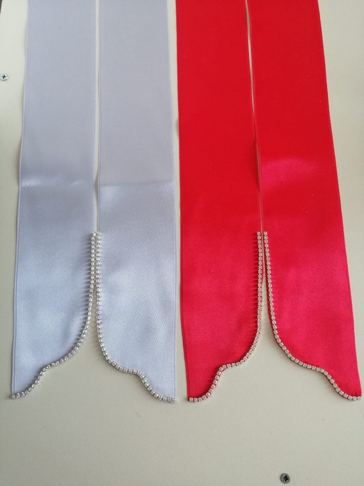 Kenarları taş detaylı, saten kırmızı beyaz kurdele , klasik tarzda ve göz alıcı bir şıklık sunar. İstenilen renkte yapılır Takı kurdelesi çifti tane 150