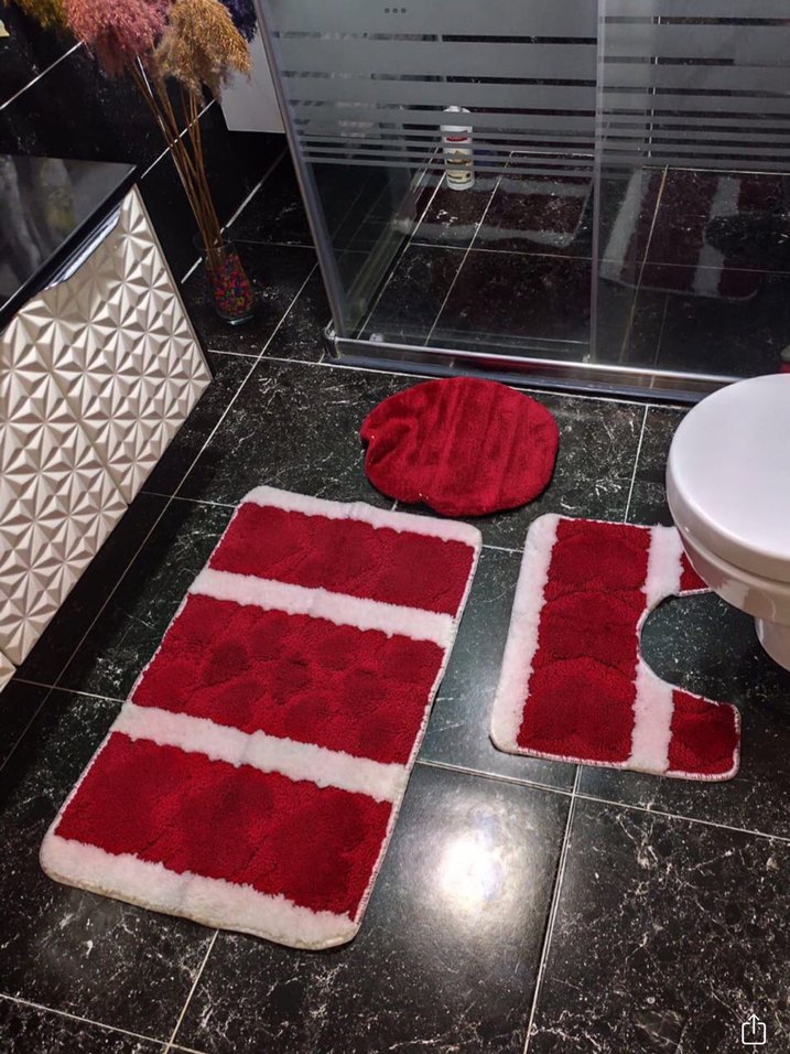 Koyu kırmızı ve beyaz şeritli üç parçadan oluşan banyo paspası seti, yumuşak ve emici kumaşı ile banyo dekorunu tamamlar. Ürünü alıp stok yaptım ama hiç kullanmadığım için evde kalmaktan altı sararıp hafif dökülmeye başladı sade kırmızı klozet kapağının örtüsü içini çektim onun içi alınırkende öyleydi diğerleri dökülse bile klozet ötüsü gibi olacağı için kullanıma engel olmaz diye ekledim