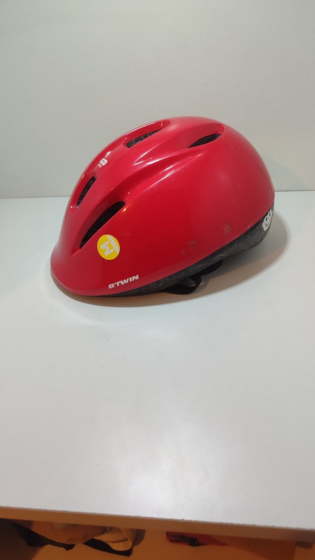 Plastik malzemeden yapılmış kırmızı biker tarzı bisiklet kaskı, Velcro kapanışlı ve minimalist tasarımlı. Üzerinde 'KID' yazısı bulunur. ️